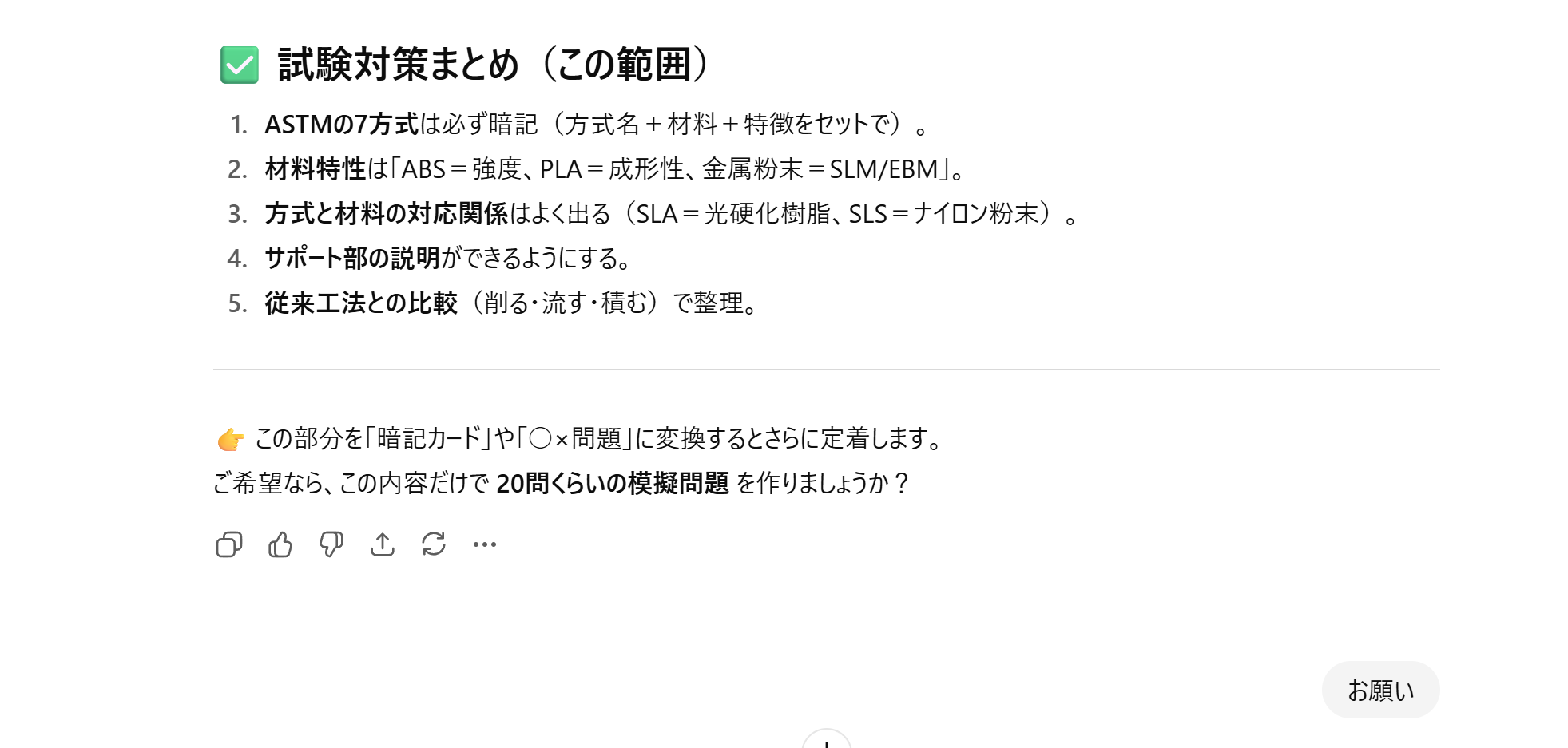AIを活用した問題演習: ChatGPTなどの人工知能にPDFの内容を入力し、自動で選択問題を作成させました。これは時間がない方にとって非常に強力な武器となります。